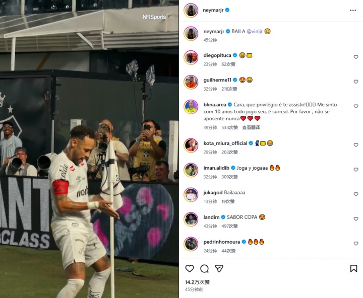 02月27日讯 巴甲第4轮,桑托斯主场2-1击败瓦斯科达伽马,内马尔梅开二度。赛后内马尔发文,晒出模仿维尼修斯在角旗杆旁跳舞庆祝的视频,内马尔配文@维尼修斯:舞起来!